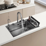 Smart kitchen sink – stainless steel honeycomb single-bowl kitchen sink with digital display and double waterfall style.